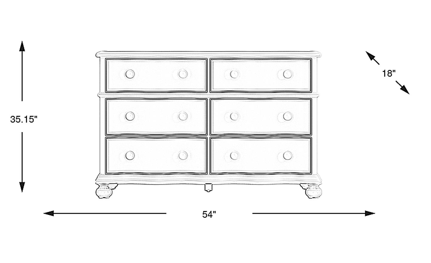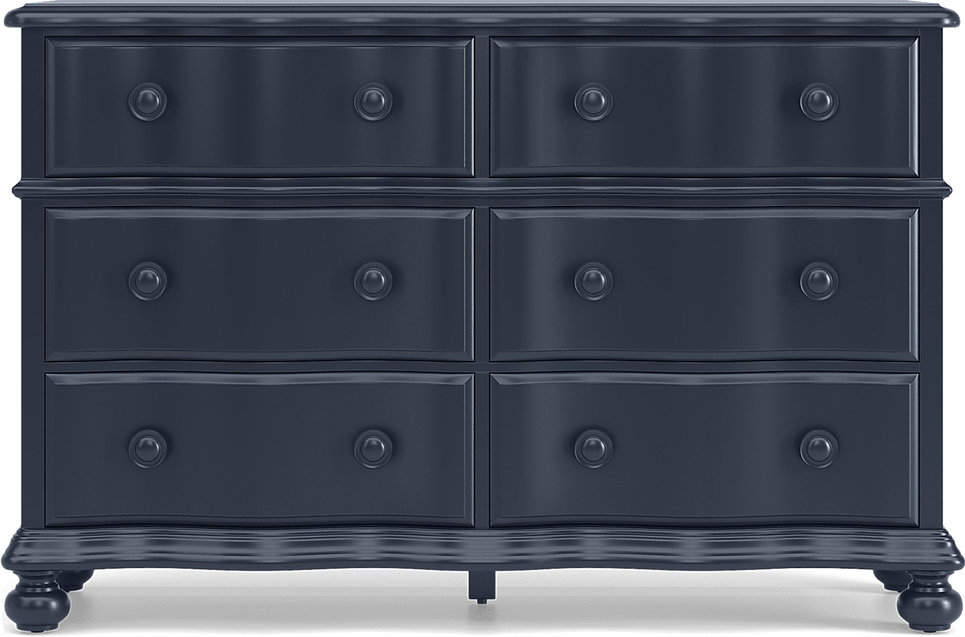 Every day is like a new adventure and the imaginative design of the San Simeon collection makes each feel more magical than the last. Crafted from solid wood in a classic blue finish, this piece features an elegantly curved case design with bowfront drawers. Each of the six drawers are crafted with French dovetail joints in the front and English dovetail joints in the back and have ball bearing side drawer glides. For more delicate items, the bottom drawers are resistant to dust and debris. Bun feet grace the dresser's base with a regal look while generous matching wood pulls give each drawer an accentuating touch.