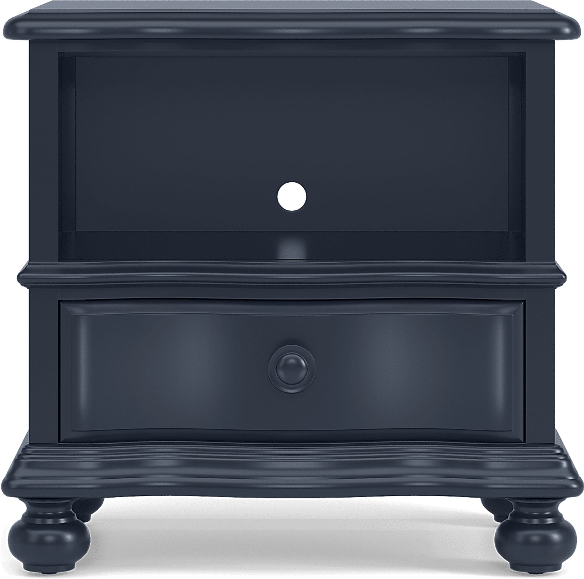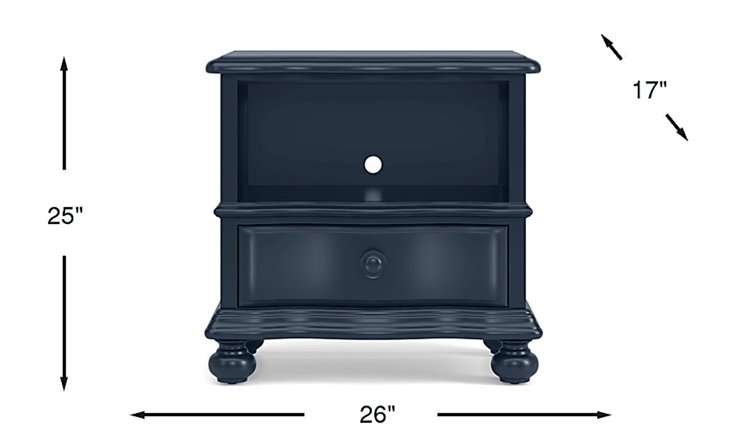Every day is like a new adventure and the imaginative design of the San Simeon collection makes each feel more magical than the last. Crafted from solid wood in a classic blue finish, this piece features an elegantly curved case design with a bowfront bottom drawer. The drawer is crafted with French dovetail joints in the front and English dovetail joints in the back with ball bearing side drawer glides. Bun feet grace the nightstand's base with a regal look while a generous matching wood pull gives the drawer an accentuating touch. The bookcase cubby offers perfect bedside space for your loved to one to place their favorite novels, comics, magazine and more.