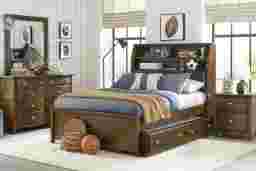 What a great idea - having a bookcase that doubles as a headboard! The Santa Cruz bed has two roomy shelves and a padded upholstered backrest panel that folds down to reveal a handy concealed storage area. Made of pine solids and veneers, the bed has a brown cherry finish, and rounded edges for safety. Mattress and foundation (if required) sold separately.