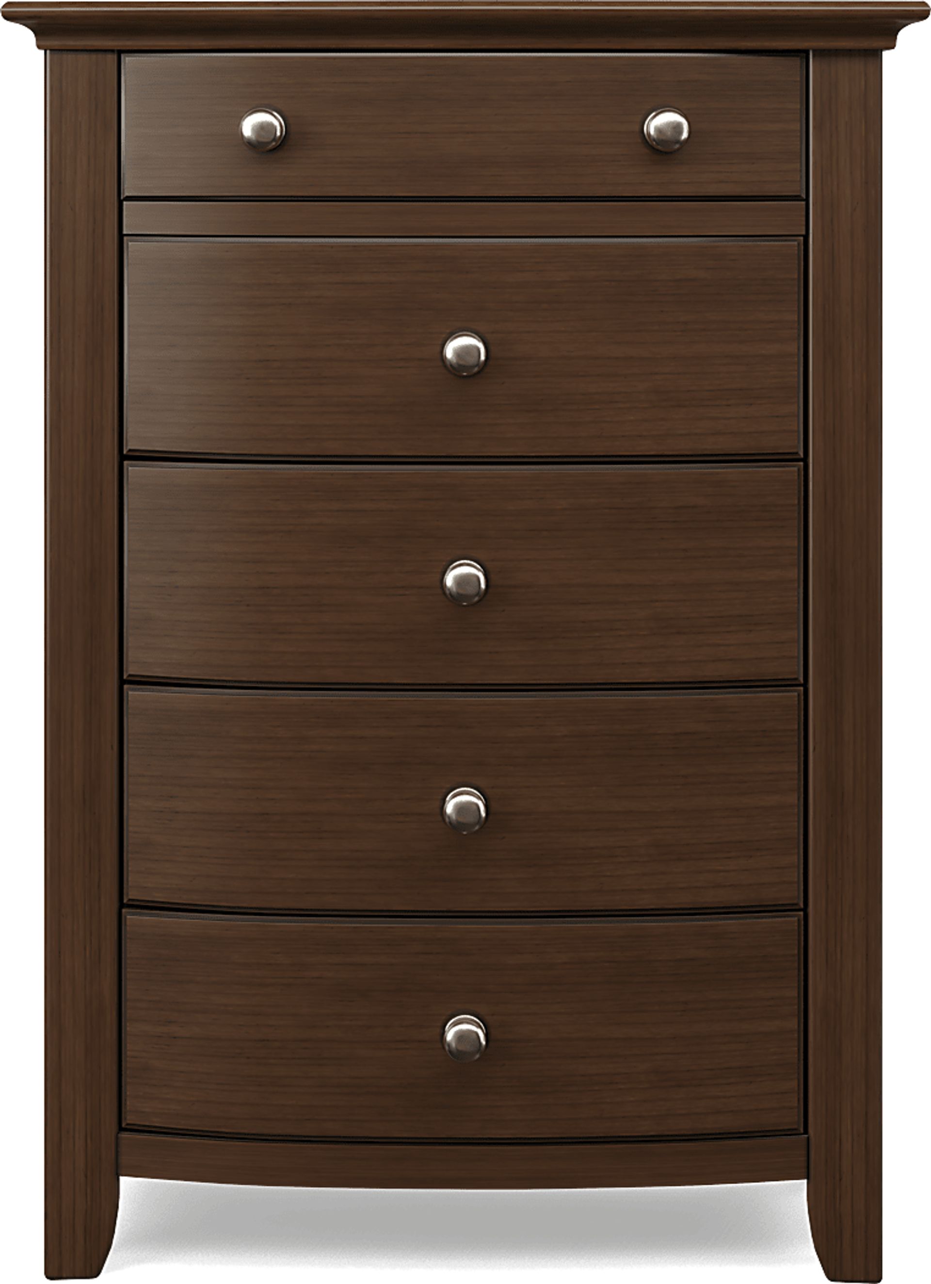 Need additional storage? The Santa Cruz chest is just the thing. Crafted in a brown cherry finish, this piece has five generous curved front drawers. All drawers feature French dovetailed front construction and dust-proofing along the bottom. Brushed nickel pulls complement the chest's contemporary contoured shape.