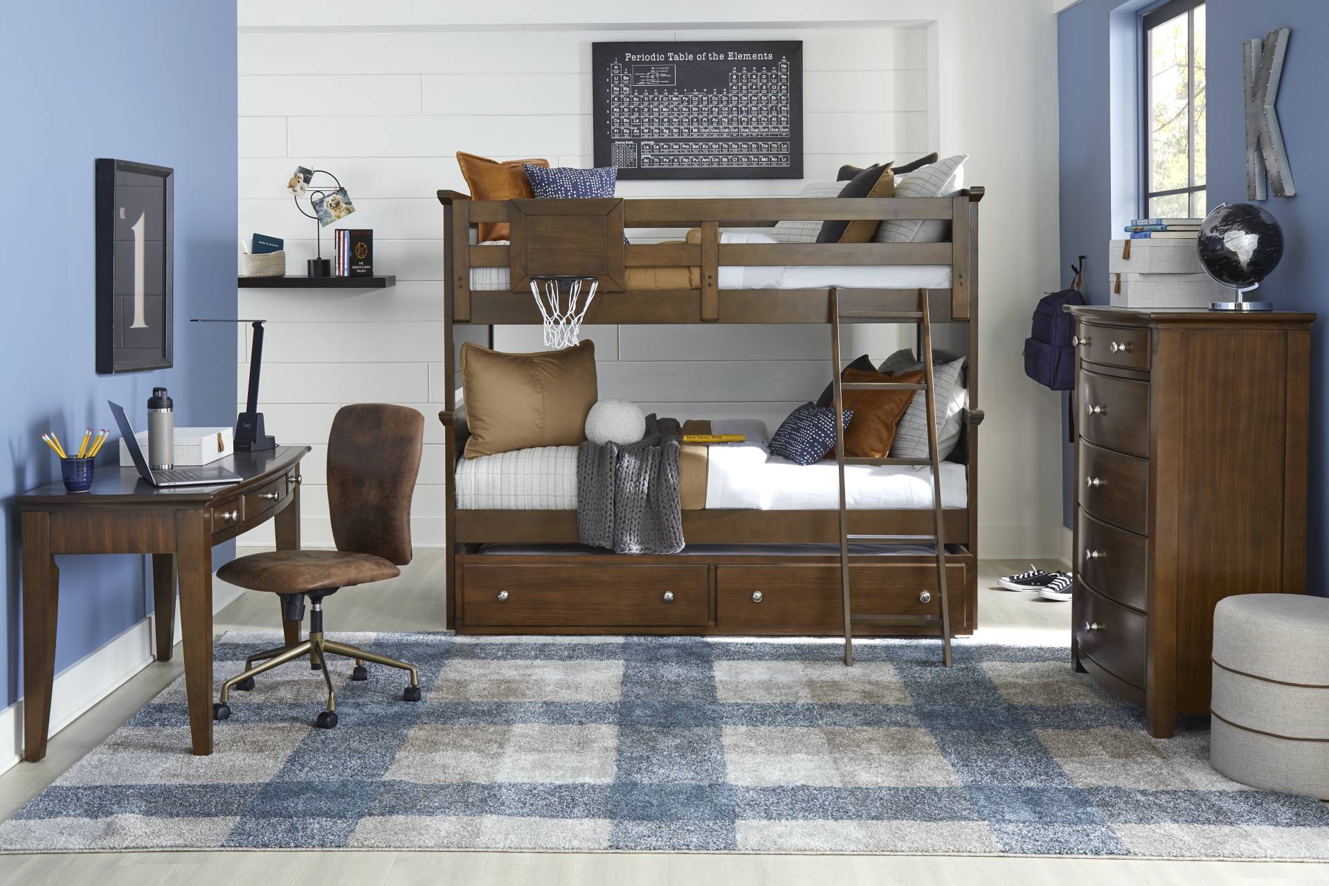 With transitional styling that will stay appealing as your child gets older, the Santa Cruz full/full bunk is a terrific choice. Made of pine solids and veneers with a brown cherry finish, this bunk is sturdy to ensure your child is safe while enjoying their new bed. Ball before bed with the included basketball hoop. Mattresses and foundations (if required) sold separately.