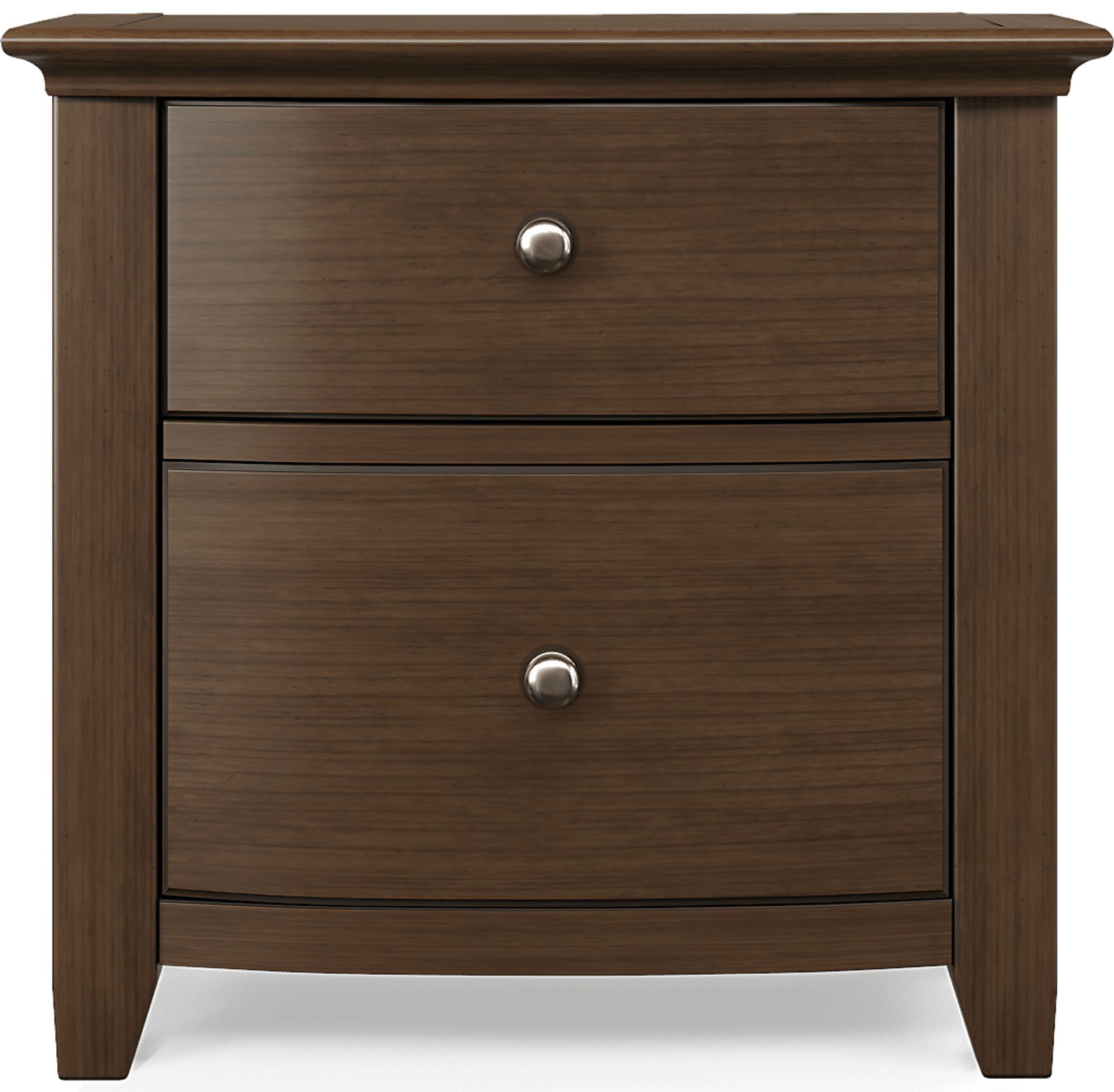 Keep bedside necessities within reach with the transitional and sleek Santa Cruz nightstand. All drawers feature dovetailed front construction. Two contoured drawers provide ample storage and are complemented by brushed nickel pulls. With a brown cherry finish, the nightstand's surface echoes the contour shape and is just right for a lamp, clock or other bedside items.