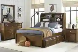 Underbed storage trundle not included. With transitional styling that will stay appealing as your child gets older, the Santa Cruz collection is a terrific choice. Made with a brown cherry finish, this set's bed features a space saving bookcase headboard with a padded backrest panel that folds down to reveal a handy concealed storage area. Contoured drawers and brushed nickel knobs accent the group, while the dresser's eight drawers can accommodate their entire wardrobe. The matching mirror's beveled surface provides an ideal place for prepping for the day ahead. To purchase the room as pictured add the trundle option above. Mattress and foundation (if required) sold separately. This product requires a bunkie board (sold separately) Bed shown is full size.