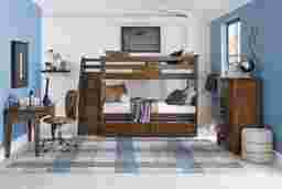 With transitional styling that will stay appealing as your child gets older, the Santa Cruz twin/twin step bunk is a terrific choice. Made with a brown cherry finish, this bunk is sturdy to ensure your child is safe while enjoying their new bed. Steps at the end of the bunk make for easy access to the top bunk while built in storage drawers keep your child's room organized and maximize space. Add a trundle (sold separately) beneath the bed for even more storage and organization potential. Mattresses and foundations (if required) sold separately.
