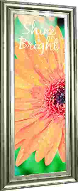 This beauty is bright indeed, now let it brighten up a wall in your home. This beautifully designed Shiny Daisy piece is elegantly framed using a 3 inch profile made of a scratch resistant MDF in silver color. It is framed under real glass and it is ready to hang with all the hardware pre-attached.