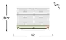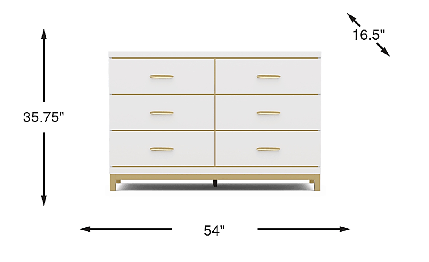 Elevating your room's storage possibilities to new heights, the Skye dresser helps keep your belongings organized and ready. Finished in a crisp white laminate, this piece features six drawers. Each drawer has French dovetail construction in front and English dovetail construction in back for durability, while metal center under-mount glides make it easy to open and close the drawers. A dust-proof panel on the bottom drawers helps keep contents protected from dust and debris. Gold-tone hardware and trim detail the dresser with a subtle hint of contrast for a perfect final touch.