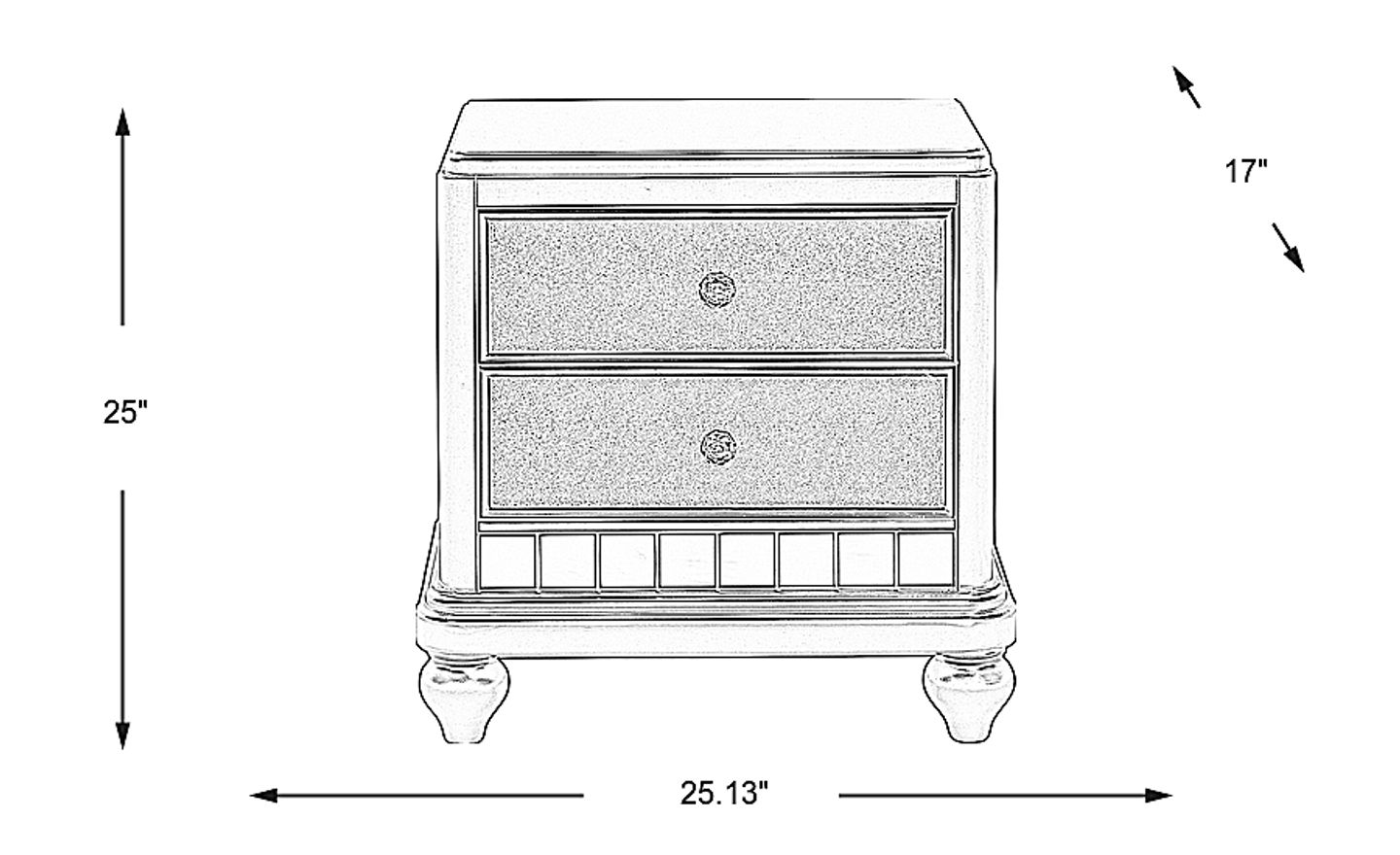 Every good bed needs a beautiful bedside companion, and the chic Petit Paris nightstand is all of that and much more! Featuring two spacious drawers boasting quality English and French dovetail construction, this nightstand's felt lined top drawer provides a safe spot for your child's valuable items. Crafted of pine solids and birch veneers in a stunning silver finish, this stylish nightstand's crystal knob drawer pulls create a glamorous look. Accented with a pretty mirrored panel right above the legs, she'll love the stylish elegance of this pretty piece.