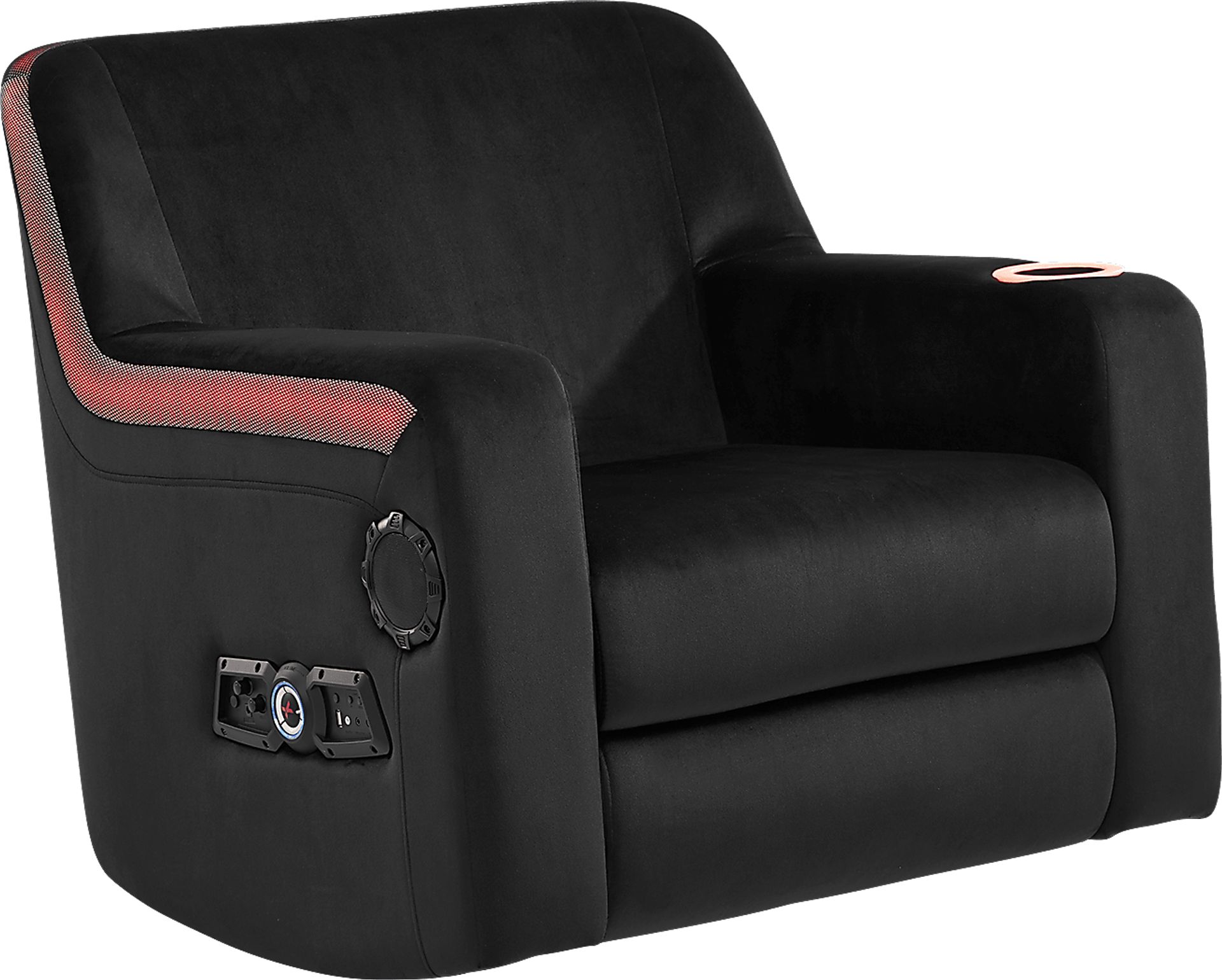 Upgrade their gaming setup with the awesome Sound Trek video gaming rocker. This piece is jam packed with features including built-in speakers, sound control dials, headphone and microphone ports, a USB charging port and adjustable seat control for that perfect seating arrangement. Upholstered in a durable black polyurethane fabric, this chair is sure to please your gamer. 100% Polyurethane