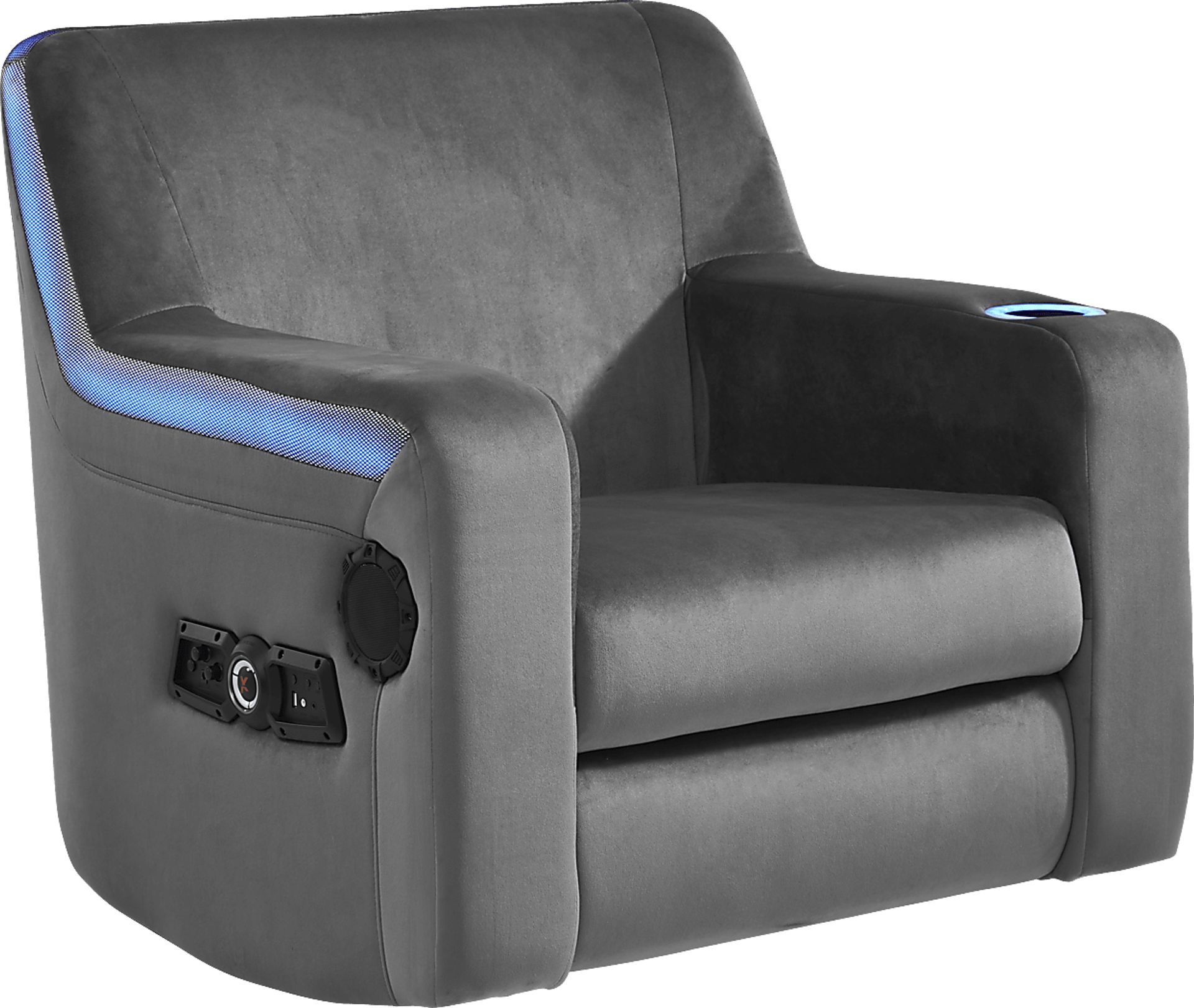 Upgrade their gaming setup with the awesome Sound Trek video gaming rocker. This piece is jam packed with features including built-in speakers, sound control dials, headphone and microphone ports, a USB charging port and adjustable seat control for that perfect seating arrangement. Upholstered in a durable gray polyurethane fabric, this chair is sure to please your gamer. 100% Polyurethane