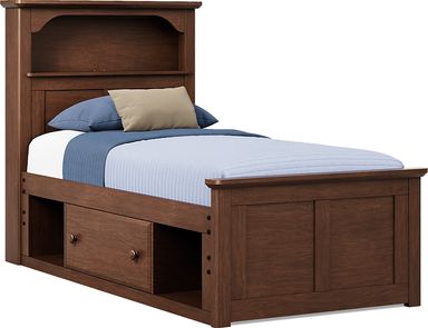 From the rich artisanship to the quaint feel, the South Bend bookcase bed adds a special charm for your child's imagination-filled days and dream-filled nights. Crafted with birch veneers in a deep brown cherry finish, this piece combines an ultra-classic look with unassuming high-tech features. The twin bed's bookcase headboard, with integrated wire management, has USB-A and USB-C ports that allow you to seamlessly charge some of your favorite electronic devices. Mattress and foundation (if required) sold separately.