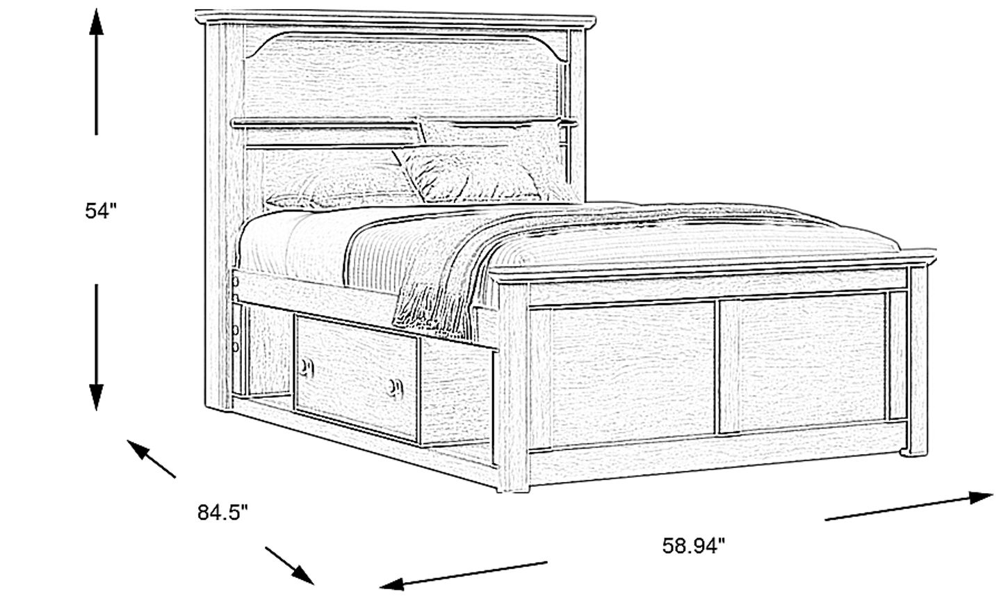 Yes, this bed is specifically designed to maximize utility in compact layouts. Measuring approximately 84.5" in depth and 59" in width, its footprint is optimized by adding vertical storage via the 54" high bookcase. For urban apartments or smaller suburban bedrooms, this multifunctional approach allows you to provide a larger full-size sleep surface for a growing child without overcrowding the room with extra storage furniture.