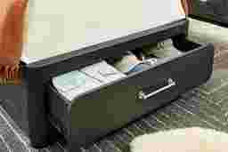 With impeccably engineered storage fitted perfectly in a low platform design, the Southside Loft bed evokes chic, modern style from every angle. The headboard has soft gray upholstery and a three-watt, overhead LED light. Bedside storage is always close at hand with two storage side rails, each featuring a single drawer that helps to square away some of your loved one's favorite things. The footboard echoes the side rails with an additional drawer. Each drawer is constructed with French dovetail joints in the front and English dovetail joints in the back with ball bearing glides. Sleek brushed nickel hardware offers irresistible contrast against the ebony finish on the bed's quarter cut oak veneers, supplying this twin storage bed with a stunning final look. Mattress and foundation (if required) sold separately. A bunkie board (sold separately) is recommended for this product.