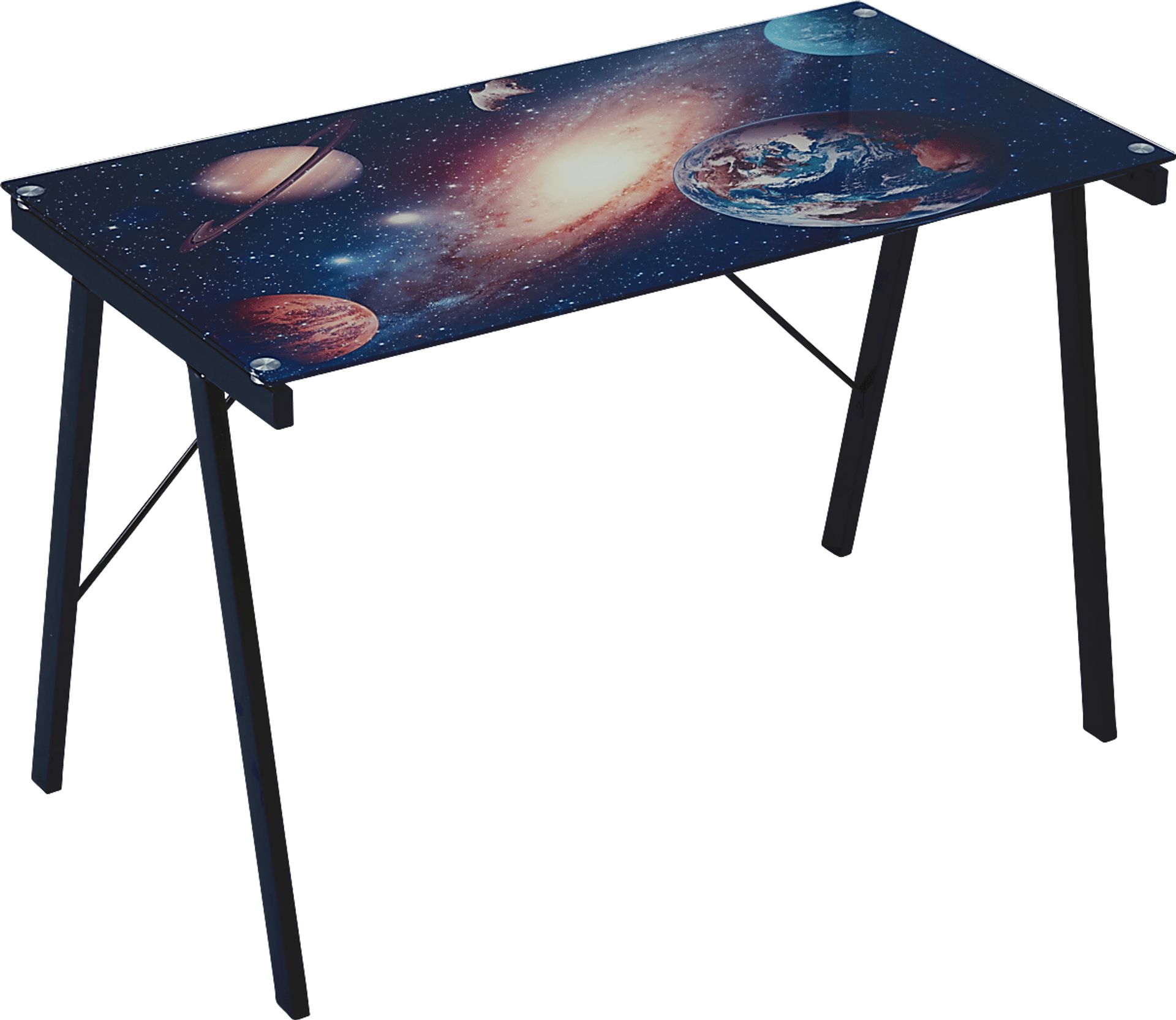 Prepare your child to explore the wonders of our solar system with the Space Galaxy desk. Made with easily wiped tempered glass and a sturdy steel frame, it can be used for studying, art projects, or even as a desk for a laptop. The versatile look makes it ideal for childhood through dorm years. Customer assembly required.