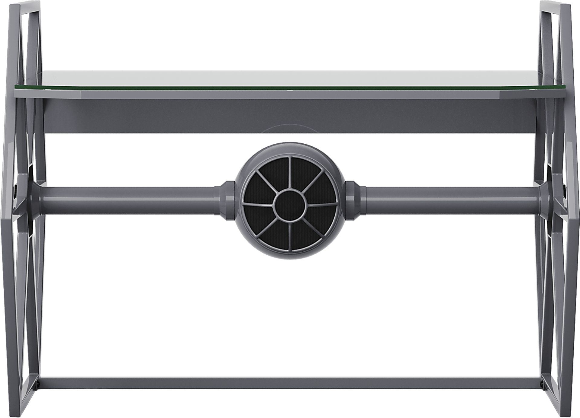 With an appearance infamous throughout the galaxy, the TIE Fighter desk is a cinematic essential for everything from styling up your home office to soaring through study time. Equipped with sleek, personalized multi-color LED light strips powered by Nanoleaf, this piece can be paired with computers and cellphones to sync the smart panels up with the rhythm and time of your favorite music and sounds. Crafted of metal with a tempered glass top and beveled corners, this desk wouldn't be complete without the dark carbonite finish that adds a spectacular final touch. The Nanoleaf® app is required for proper use of this product.