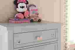 The Starry Dreams with Minnie Mouse chest is the perfect choice for those looking to bring spacious storage to their child's bedroom. With five drawers that feature custom pink bow pulls, you'll enjoy plenty of room for keeping their clothing organized. Crafted of hardwood solids, this piece comes in a painted gray finish that blends well with a wide range of styles. Included is a removeable art panel that features a playful depiction of Minnie Mouse under the stars.