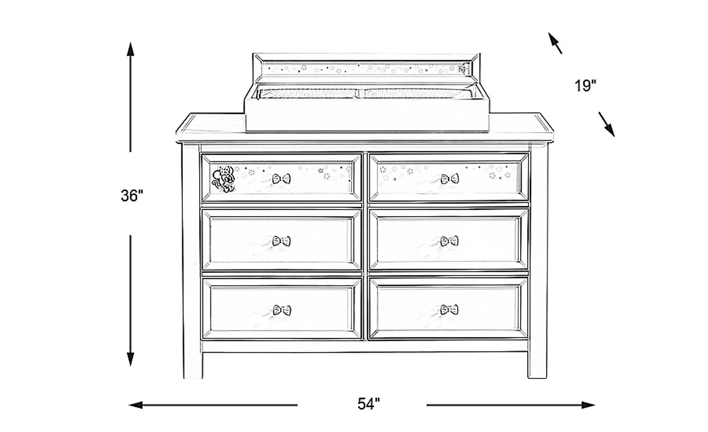 Bring functional storage space and beautiful looks to your child's bedroom with the Starry Dreams with Minnie Mouse dresser. Six spacious drawers with custom pink bow pulls provide plenty of room for clothing, school supplies and much more. Crafted of hardwood solids, this piece comes in a painted gray finish that blends well with a wide range of styles. A matching changing topper and pad complete the piece. Included is a removeable art panel that features a playful depiction of Minnie Mouse under the stars.