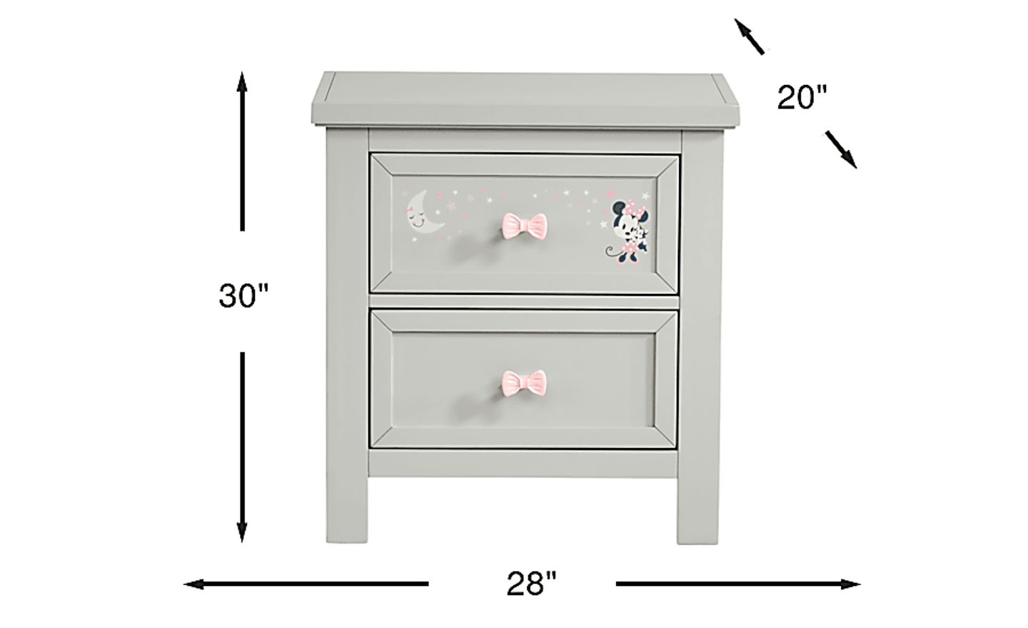 Whether they need extra storage space or a touch of fun style in their bedroom, the Starry Dreams with Minnie Mouse nightstand is an excellent choice. Two drawers with custom pink bow pulls provide room for reading materials and more while the tabletop can be used for displaying their favorite photos and décor. Crafted of hardwood solids, this piece comes in a painted gray finish that blends well with a wide range of styles. Included is a removeable art panel that features a playful depiction of Minnie Mouse under the stars.