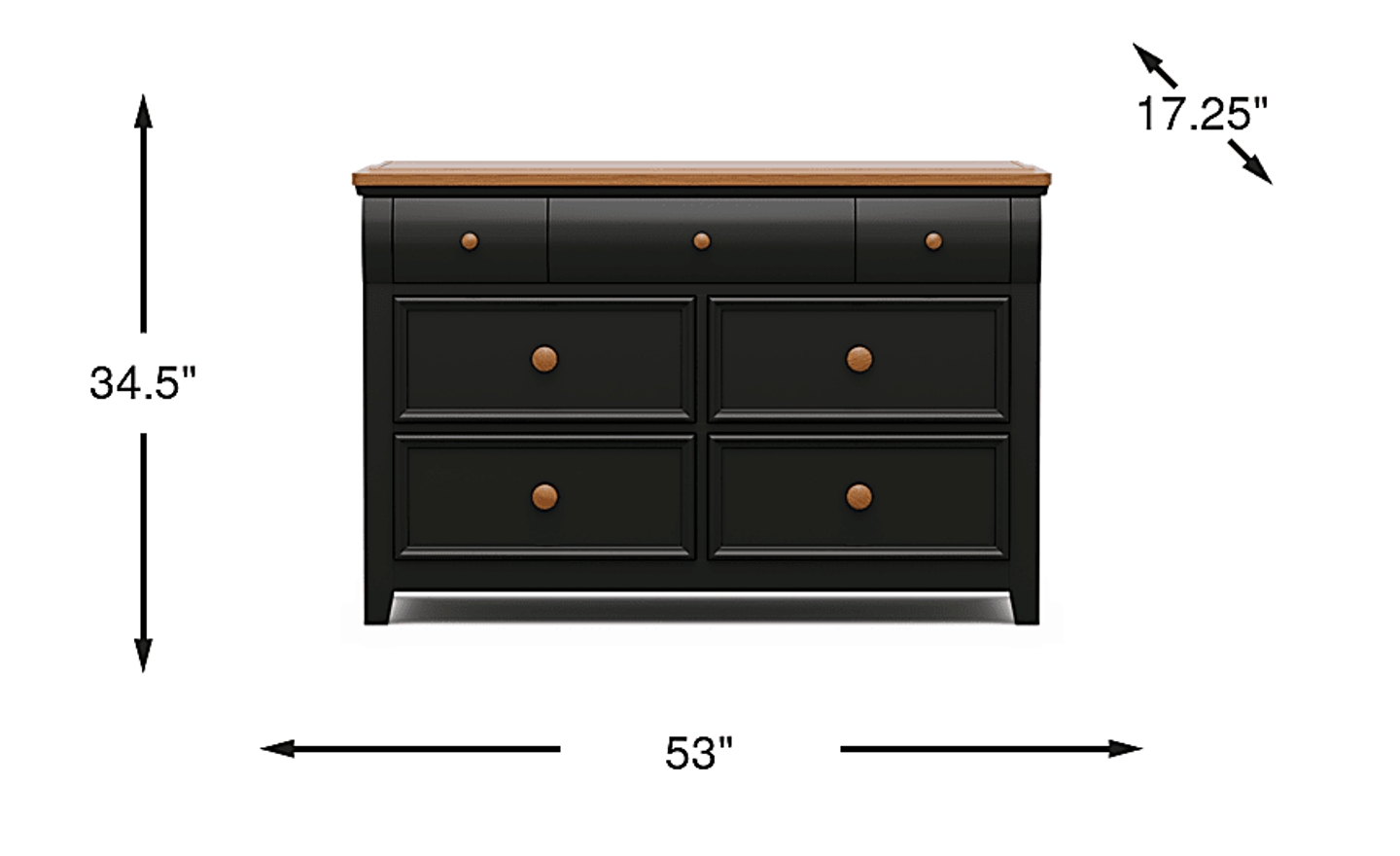 Serene design and timeless balance define the Sugar Hollow dresser, where thoughtful craftsmanship meets the ease of growing up in style. Embodying this harmony, the dresser is equipped with seven spacious drawers featuring French dovetail joinery in front for enhanced durability. Each drawer smoothly opens and closes with ease thanks to the side-mounted, ball-bearing metal glides. Beautiful black finish and soothing pine veneer accents highlight the architectural simplicity of the collection. The drawer knobs are finished with a warm chestnut color that offers perfect coordination with the veneers.