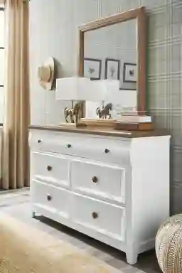 Based on our furniture care expertise, we recommend dusting the dresser regularly with a soft, clean cloth to prevent buildup. For cleaning spills or marks, use a soft cloth dampened with a mild soap and water solution, and dry the surface immediately afterward. It is crucial to avoid harsh chemical cleaners, waxes, or abrasives, as these can damage the pine veneers and degrade the protective white finish over time.