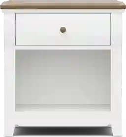 Serene design and timeless balance define the Sugar Hollow nightstand, where thoughtful craftsmanship meets the ease of growing up in style. Embodying this harmony, the nightstand is equipped with a single spacious drawer featuring French dovetail joinery in front for enhanced durability. Metal, side-mounted ball-bearing glides ensure the drawer opens and closes smoothly, while the open lower shelf provides versatile storage or display space. Beautiful white finish and soothing pine veneer accents highlight the architectural simplicity of the collection. The drawer's knob is finished with a warm chestnut color that offers perfect coordination with the veneers.