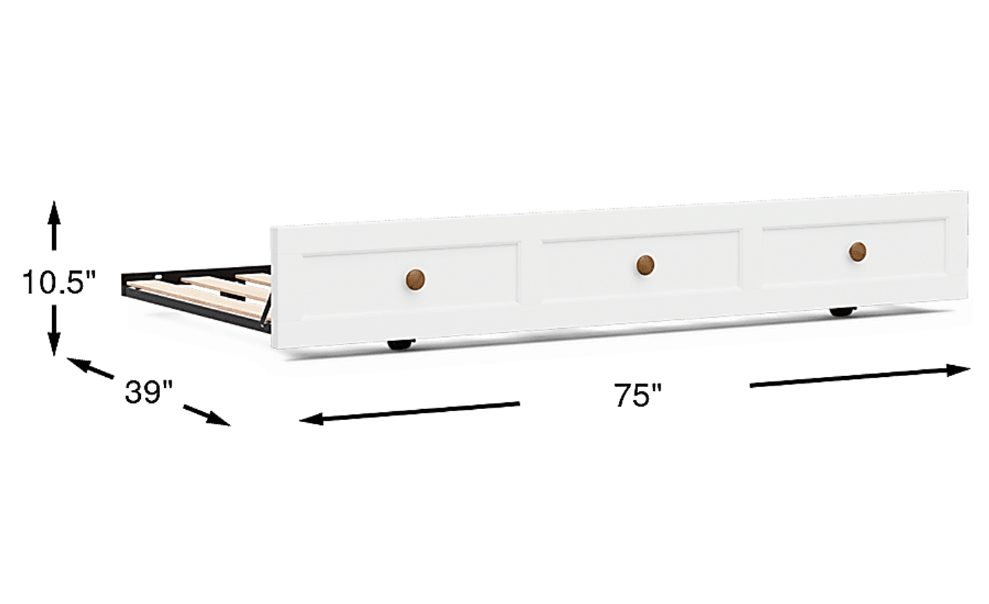 Serene design and timeless balance define the Sugar Hollow twin trundle, where thoughtful craftsmanship meets the ease of growing up in style. The spacious underbed compartment glides smoothly on hidden casters, providing easy access to a twin-size mattress that can be stored neatly underneath the bed. A rich white finish paired with soothing chestnut-tone knobs create a subtle contrast that ties the look together. Perfect for maximizing space without compromising style, this piece completes the bedroom with quiet sophistication and enduring utility. Mattress sold separately.