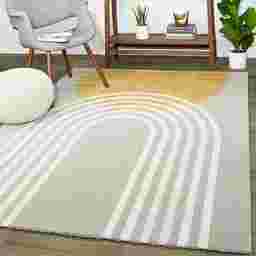 Bring a touch of magic to your child's room with our Moon Door rug featuring a white rainbow pattern. Soft and durable, it's perfect for playtime, storytime or any time. Its neutral color scheme will blend seamlessly with any room decor, while its playful pattern will add a fun and whimsical touch. Plus, it's easy to clean and maintain, making it the perfect addition to any busy household. This supple, smooth low pile rug with a 100% microset polypropylene pile is stain resistant and non-shedding. Customer assembly required.
