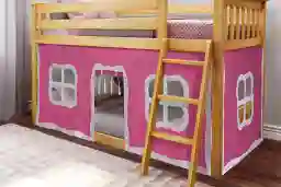 The area under the top bunk offers a 31-inch clearance, providing a versatile space for organization or imagination. This model includes a removable, hand-sewn 100% cotton pink tent that attaches with hook and loop fasteners, transforming the space into a cozy play nook. If you need storage instead, the curtains can be removed to accommodate low-profile bins or a play rug.