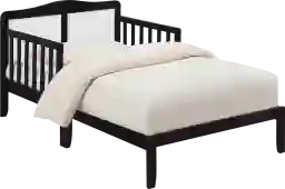 The Trovia Toddler Bed is simple and sophisticated.Striking finishes that complement the solid panel white headboard and a low profile footboard,designates as the perfect nesting spot for your toddler.Complete with dual side guardrails for security at night.The Trovia also features a solid wood frame, solid slat rails, and secondary support leg for extra durability. Customer assembly is required.