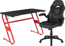 Let the games begin on the Turole gaming desk and chair set. A sleek, red z-frame offers stability and style for a cool looking desk setup. The black top gamers table has two grommets for cable management, a detachable cup holder and headset holder to keep you in game mode. The black racing game chair have flip-up arms to comfortably rest your arms on while handling the controller or flip-up to slide under the desk. Be true to the gaming experience with a desk and chair combo designed for gaming systems. A spacious desktop that can hold up to 2 monitors adds more excitement to the game. Use the cup holder to prevent beverages from spilling on your pc gaming keyboard. The comfortably padded ergonomic gaming chair has a full swivel cylinder and adjusts with the pneumatic lever. Tilt back with ease by pulling the lever outward, control the force needed to recline by turning the knob underneath the seat. Made for gamers, this gaming desk and chair bundle will get you on your way to leveling up. Customer assembly is required.