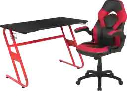 Let the games begin on the Turole gaming desk and chair set. A sleek, red z-frame offers stability and style for a cool looking desk setup. The black top gamers table has two grommets for cable management, a detachable cup holder and headset holder to keep you in game mode. The black/red racing game chair have flip-up arms to comfortably rest your arms on while handling the controller or flip-up to slide under the desk. Be true to the gaming experience with a desk and chair combo designed for gaming systems. A spacious desktop that can hold up to 2 monitors adds more excitement to the game. Use the cup holder to prevent beverages from spilling on your pc gaming keyboard. The comfortably padded ergonomic gaming chair has a full swivel cylinder and adjusts with the pneumatic lever. Tilt back with ease by pulling the lever outward, control the force needed to recline by turning the knob underneath the seat. Made for gamers, this gaming desk and chair bundle will get you on your way to leveling up. Customer assembly is required.