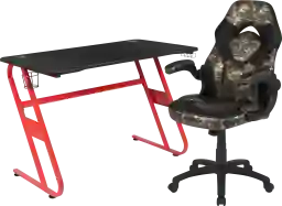 Let the games begin on the Turole gaming desk and chair set. A sleek, red z-frame offers stability and style for a cool looking desk setup. The black top gamers table has two grommets for cable management, a detachable cup holder and headset holder to keep you in game mode. The camouflage game chair have flip-up arms to comfortably rest your arms on while handling the controller or flip-up to slide under the desk. Be true to the gaming experience with a desk and chair combo designed for gaming systems. A spacious desktop that can hold up to 2 monitors adds more excitement to the game. Use the cup holder to prevent beverages from spilling on your pc gaming keyboard. The comfortably padded ergonomic gaming chair has a full swivel cylinder and adjusts with the pneumatic lever. Tilt back with ease by pulling the lever outward, control the force needed to recline by turning the knob underneath the seat. Made for gamers, this gaming desk and chair bundle will get you on your way to leveling up. Customer assembly is required.