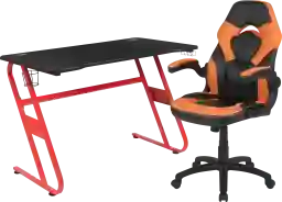 Let the games begin on the Turole gaming desk and chair set. A sleek, red z-frame offers stability and style for a cool looking desk setup. The black top gamers table has two grommets for cable management, a detachable cup holder and headset holder to keep you in game mode. The black/orange racing game chair have flip-up arms to comfortably rest your arms on while handling the controller or flip-up to slide under the desk. Be true to the gaming experience with a desk and chair combo designed for gaming systems. A spacious desktop that can hold up to 2 monitors adds more excitement to the game. Use the cup holder to prevent beverages from spilling on your pc gaming keyboard. The comfortably padded ergonomic gaming chair has a full swivel cylinder and adjusts with the pneumatic lever. Tilt back with ease by pulling the lever outward, control the force needed to recline by turning the knob underneath the seat. Made for gamers, this gaming desk and chair bundle will get you on your way to leveling up. Customer assembly is required.