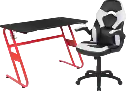Let the games begin on the Turole gaming desk and chair set. A sleek, red z-frame offers stability and style for a cool looking desk setup. The black top gamers table has two grommets for cable management, a detachable cup holder and headset holder to keep you in game mode. The black/white racing game chair have flip-up arms to comfortably rest your arms on while handling the controller or flip-up to slide under the desk. Be true to the gaming experience with a desk and chair combo designed for gaming systems. A spacious desktop that can hold up to 2 monitors adds more excitement to the game. Use the cup holder to prevent beverages from spilling on your pc gaming keyboard. The comfortably padded ergonomic gaming chair has a full swivel cylinder and adjusts with the pneumatic lever. Tilt back with ease by pulling the lever outward, control the force needed to recline by turning the knob underneath the seat. Made for gamers, this gaming desk and chair bundle will get you on your way to leveling up. Customer assembly is required.