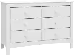 Introducing the Vespe 6-Drawer Double Dresser. This dresser is perfect for any nursery or kids' room, featuring six spacious drawers to store and organize essentials. Constructed from sturdy, high-quality engineered wood, it is warp-resistant and built to last. The Vespe dresser includes smooth-gliding Euro-glide drawers with safety stops and German cam locks. Its stain-resistant surface is easy to clean, and its universal design fits seamlessly into any decor. For added peace of mind, this dresser meets or exceeds all federal and anti-tipping safety standards. It is backed by a 1-year limited manufacturer's warranty. Customer assembly is required.