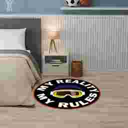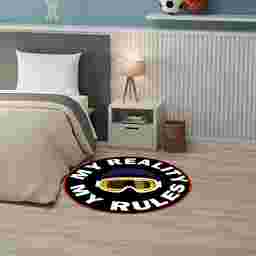 Make a bold statement in your childs room with this round kids rug. The softly textured surface features the printed phrase My Reality My Rules paired with a helmet and goggles that creates a cool, fun vibe. This rug is machine-washable with a non-skid back for easy-cleaning and safety perfect for a child or tween bedroom. Vacuum regularly no beater bar Immediately spot clean with damp cloth This Rug Is Machine Washable. Machine Wash Cold. Do not Bleach, line dry. Cool Iron if needed. When washing Rugs 8x10 or larger, use a larger capacity commercial grade washing machine.