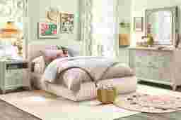 Like most kids, the Vivien collection is the perfect alchemy of equal parts daring and darling, especially when paired with the Charlize upholstered bed. Crafted to have a pearlized white effect with wirebrush gray finish, the dresser in this set has an abundance of storage features and ultra convenient charging. Each drawer is constructed with soft, self-closing glides and features front and back English dovetailing for durability. Felt lined top drawers, a hidden jewelry tray, and AC ports alongside matching USB power ports enhance the dresser's appeal. The mirror's frame has hooks and ring organizers alongside a white LED touch light and even more USB charging. Covered with fuzzy pink channels, the platform bed's low-profile design features reversible side rails, allowing you to tailor your mattress and foundation height by placing them inside or on the frame. Offering a final touch of convenience, the bed's headboard is equipped with USB-A and USB-C charging ports. Mattress and foundation (if required) sold separately. Upholstery: 100% Polyester