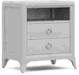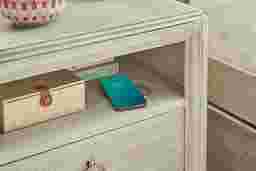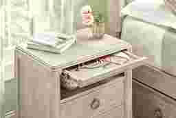 Like most kids, the Vivien collection is the perfect alchemy of equal parts daring and darling. Crafted to have a pearlized white effect with wirebrush gray finish, this piece features a concealed felt-lined top drawer built into the molding of the nightstand, USB-A and USB-C fast charging ports, and wireless charging. Both drawers are constructed with soft, self-closing glides and feature front and back English dovetailing for enhanced durability. Ring hardware buttons the look with a sweet final touch.