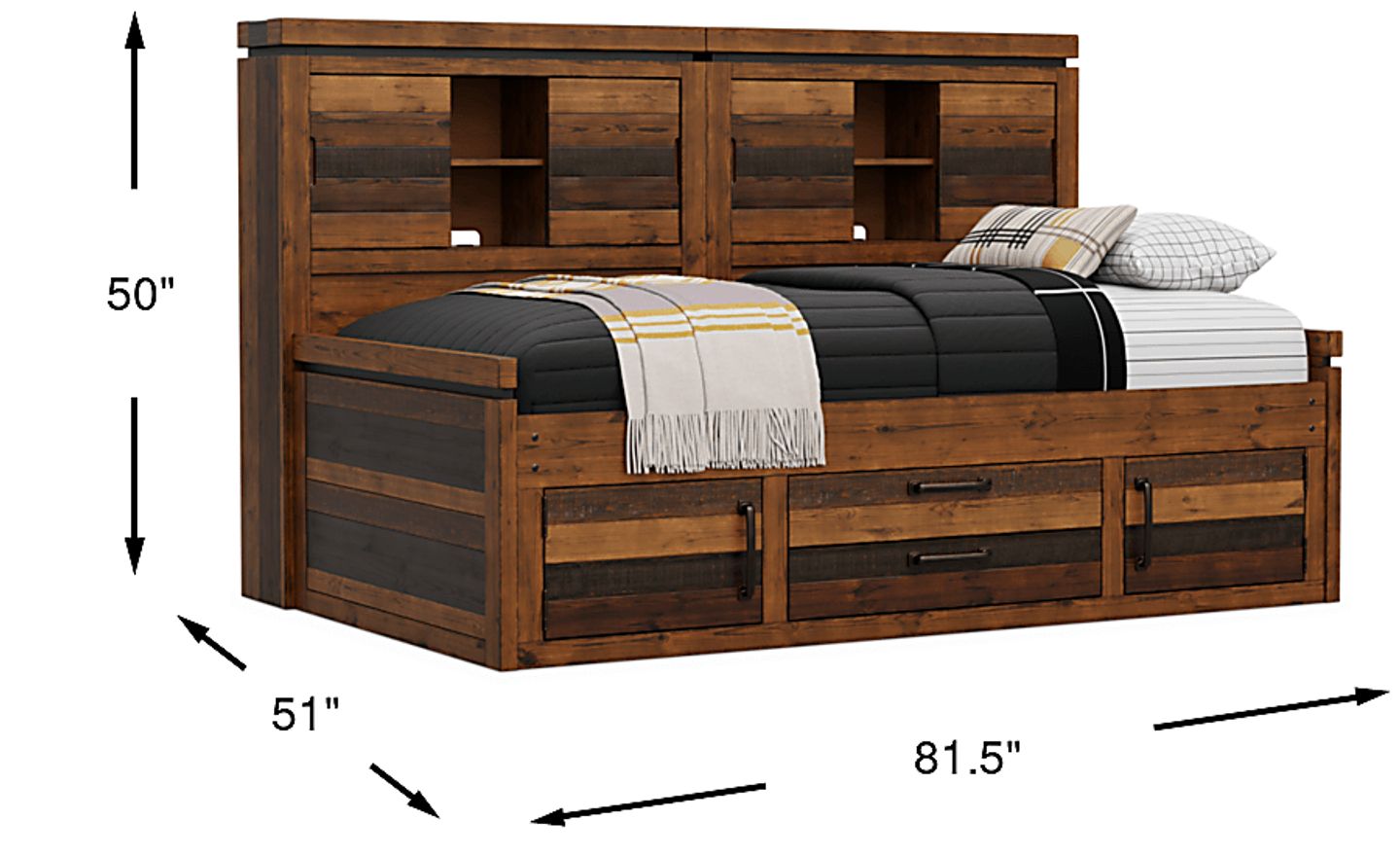 This bed is designed as a comprehensive storage solution for active kids' rooms. Beyond the classic bookcase headboard, which features integrated shelving for books, electronics, and trophies, it includes a unique storage side rail. This built-in rail offers a dedicated space for clothing or extra linens, effectively acting as a low-profile dresser. To further maximize organization, an optional underbed storage trundle is available for purchase, providing a hidden spot for toys or guest mattresses.