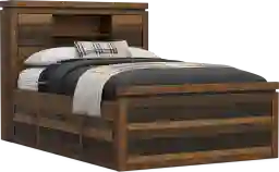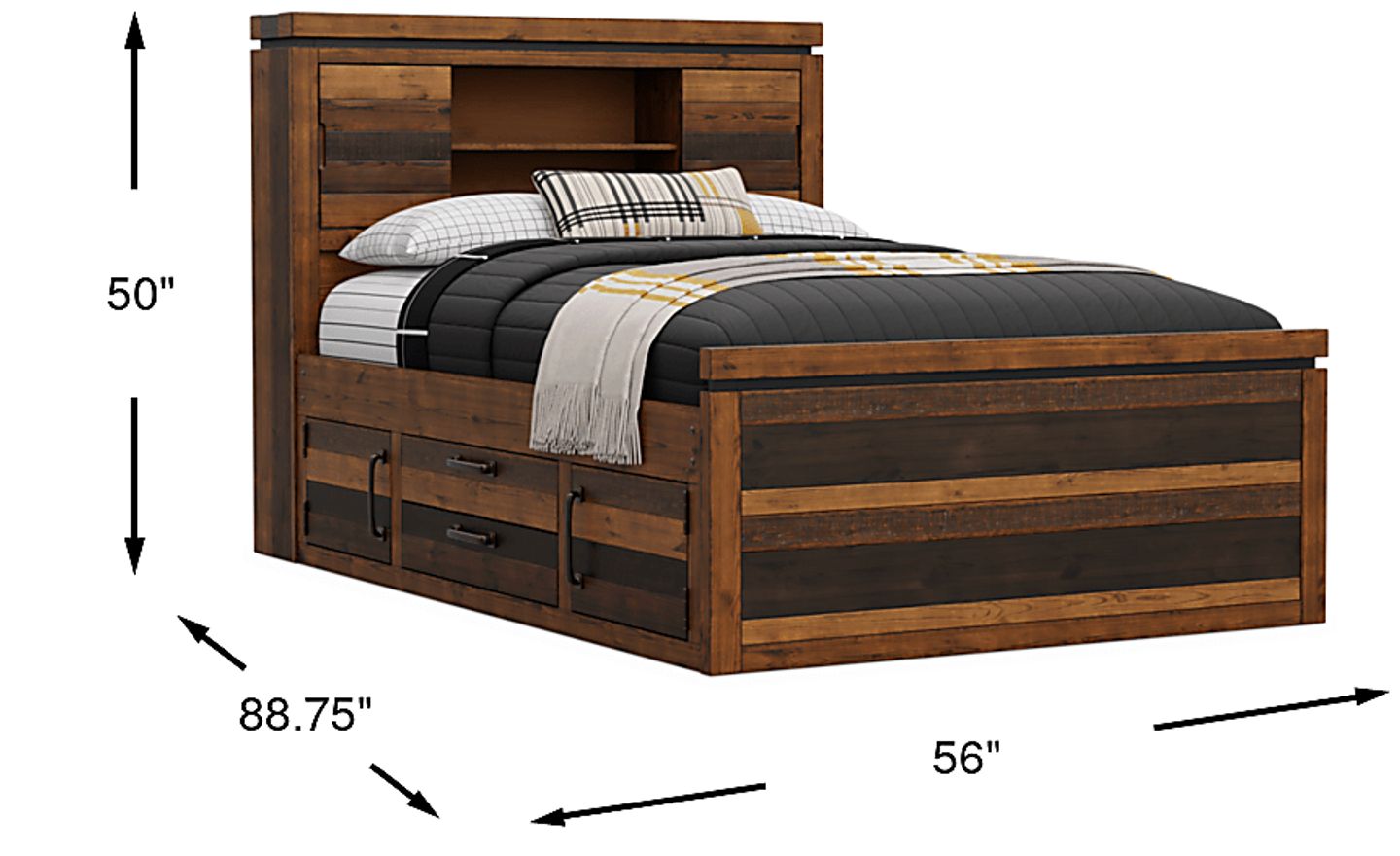 Give you child a stunning rustic retreat they'll love coming home to with the Westover Hills Jr. full bed. This stylish piece is constructed with pine veneers in a striking multi-tone brown finish. The headboard features shelves that are great for storing books, pictures and your loved one's other favorite items. For additional functionality, the bed includes two storage side rails to give your loved one additional space for clothing and more. Underbed twin storage trundle available for purchase. Mattress and foundation (if required) sold separately.