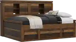 This bed is designed to be a complete storage solution, featuring a multi-shelf bookcase wall perfect for organizing books, photos, and personal items. In addition to the headboard shelving, this specific model includes a storage side rail, which provides integrated drawer space for clothing, toys, or extra bedding. By utilizing both the vertical space of the headboard and the side of the frame, this bed helps eliminate clutter and can often replace the need for an additional chest or bookshelf in the room.