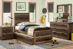 Give you child a stunning rustic retreat they'll love coming home to with the Westover Hills Jr. twin bed. This stylish piece is constructed of pine solids and veneers in a striking multi-tone brown finish. The panel headboard features a horizontal wood plank design for a bit of industrial appeal. Underbed twin storage trundle available for purchase. Mattress and foundation (if required) sold separately.