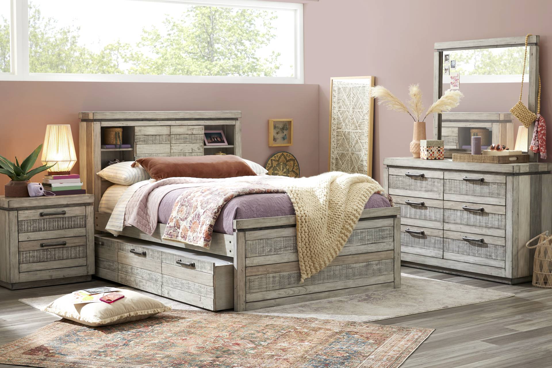 Includes:gray full bookcase bed with 2 storage rails • gray dresser • gray mirror
