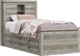 Give your child a stunning bed they'll love coming home to with the Westover Hills Jr. twin bed. Crafted with pine veneers in a striking multi-tone gray finish, this rustic twin bookcase bed features a storage headboard with dual USB-A ports for easy access to charging. For additional functionality, the bed includes two storage side rails with plenty of space for clothing and more. Mattress and foundation (if required) sold separately.