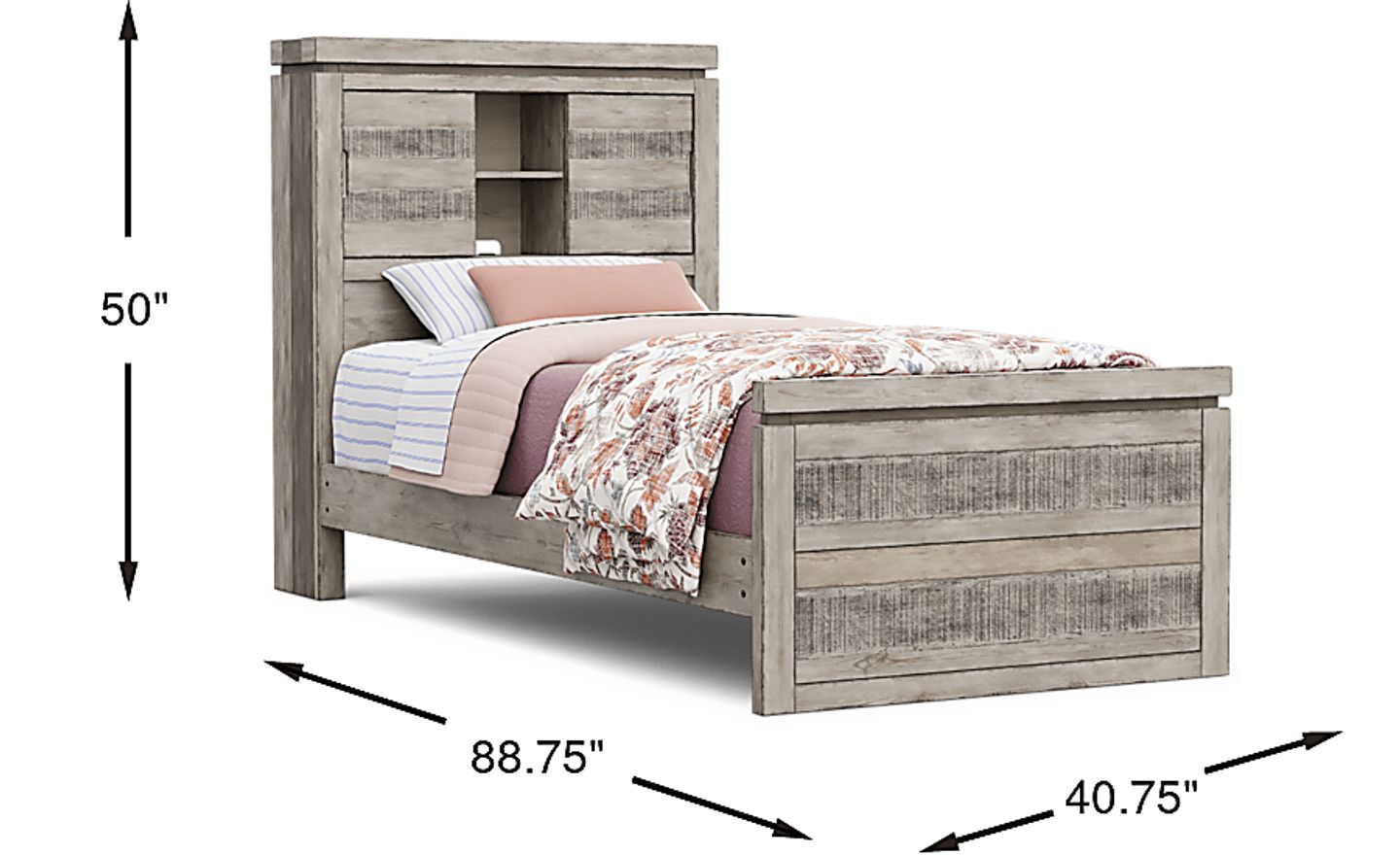 Give your child a stunning bed they'll love coming home to with the Westover Hills Jr. twin bed. Crafted with pine veneers in a striking multi-tone gray finish, this rustic twin bookcase bed features a storage headboard with dual USB-A ports for easy access to charging. Mattress and foundation (if required) sold separately. Trundle sold separately.