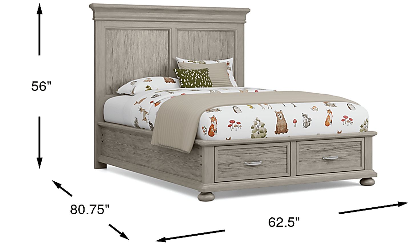 With a sprinkle of fun and a dash of style, the Woodland Adventures storage bed makes for a dreamy addition to your child's bedroom. Melding timeless charm and everyday functionality, the full bed is crafted of solid poplar in classic gray finish. Perfect for cozy pajamas, cuddly stuffed animals and secret treasures, this piece's storage footboard is equipped with two drawers forged with front and back English dovetailing for enhanced durability. Side mounted, ball bearing glides provide an ultra-smooth pathway for the drawers to open and shut. Decorative molding and bun feet highlight the piece's understated elegance, creating a look that's casual yet sophisticated. Mattress and foundation (if required) sold separately.