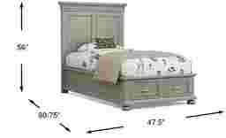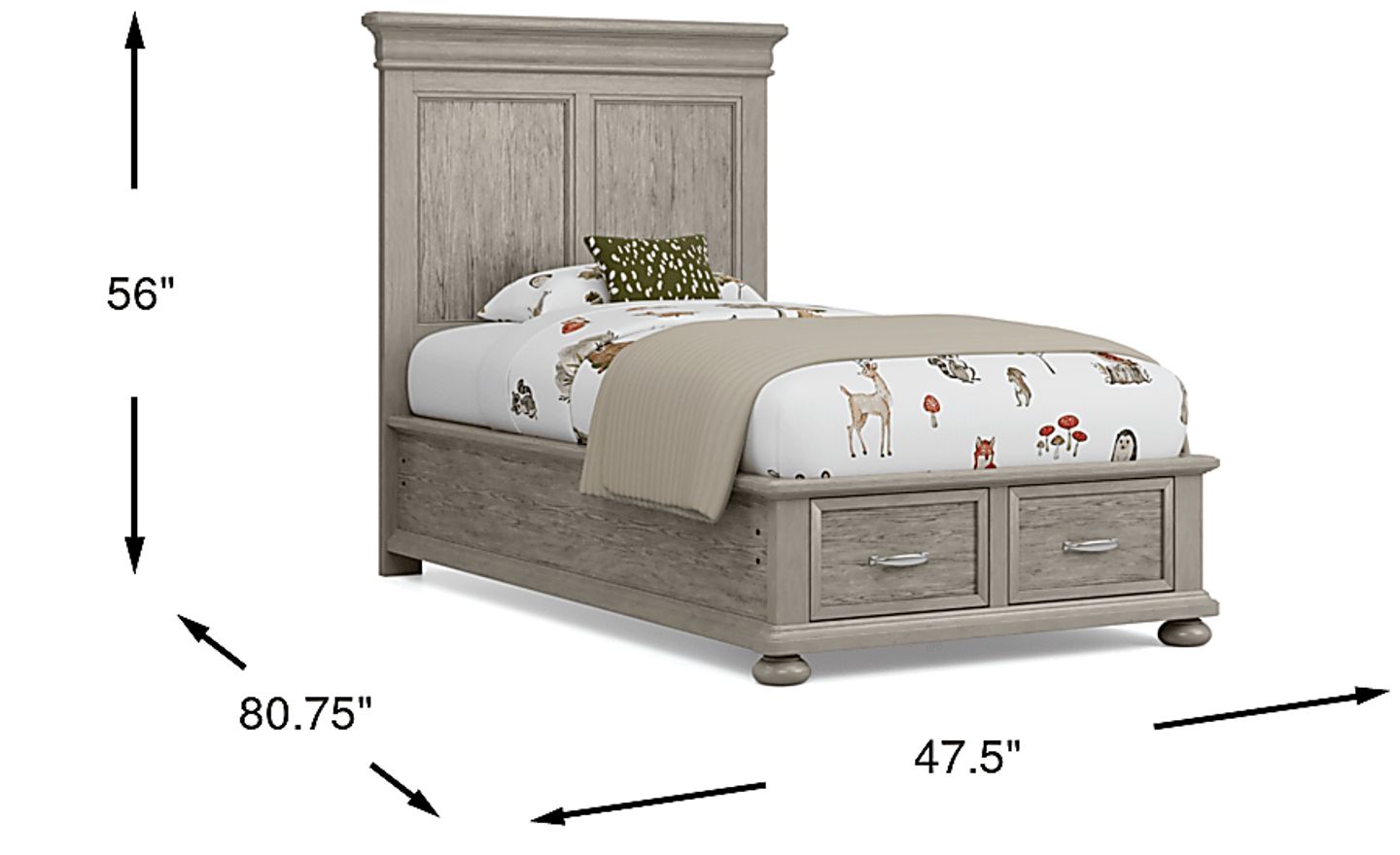 With a sprinkle of fun and a dash of style, the Woodland Adventures storage bed makes for a dreamy addition to your child's bedroom. Melding timeless charm and everyday functionality, the twin bed is crafted of solid poplar in classic gray finish. Perfect for cozy pajamas, cuddly stuffed animals and secret treasures, this piece's storage footboard is equipped with two drawers forged with front and back English dovetailing for enhanced durability. Side mounted, ball bearing glides provide an ultra-smooth pathway for the drawers to open and shut. Decorative molding and bun feet highlight the piece's understated elegance, creating a look that's casual yet sophisticated. Mattress and foundation (if required) sold separately.