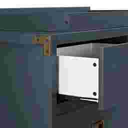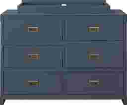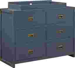 Create a space that is fun and sophisticated with the delightful Kiernan blue dresser and topper set. Combining campaign and modern style, this charismatic dresser is crafted with a sturdy wood construction and includes six spacious drawers. From functionality also sprang great design with modern features such as clean lines, a fresh graphite blue finish, and aged brass sunken metal pull drawer handles. The Kiernan blue dresser topper is also crafted with a sturdy wood construction in a fresh graphite blue finish. This dresser topper securely fastens to the Kiernan dresser to transform it into a convenient changing area. Combine the Kiernan blue dresser and topper set with the Kiernan blue crib to design a playfully sophisticated nursery room that will live, move, and grow alongside your child. Crib sold separately. Customer assembly required. Customer assembly required.