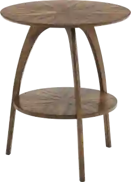 The Kimba round end table introduces sophistication and style in any living space. Drawn from the iconic architecture of the 1960s Los Angeles International Airport control tower, this side table captures mid-century design with plenty of practicality. Showcasing stunning Mindi veneers with a captivating starburst pattern on the top, this table boasts rich wood grain patterns that exude warmth and natural allure in a nutmeg finish. Ideal for placement next to your sofa as a side table. Or stage it under a window as an accent table and top with a lamp or piece of art. The round shape also allows it to serve as a space-saving nightstand, and a lower shelf is perfect for storing reading materials or displaying decor. Compact yet spacious, this end table is a conversation starter and a statement piece. Customer assembly is required.