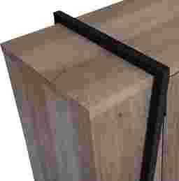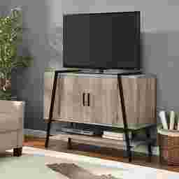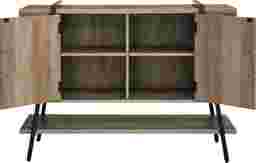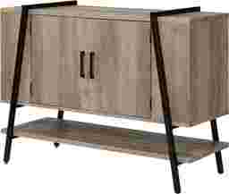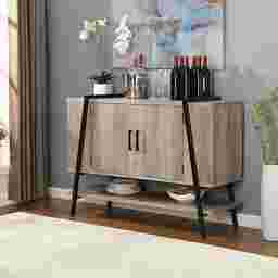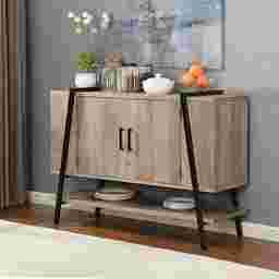 Complete your home decor with this stylish Kimbark mid-century server cabinet with a beige distressed finish. This unit have metal decorative legs and double wood doors with knobs on each door, allowing easy access for entry. Inside the server there is a middle divider and a shelf for any other items you need to store. There is an open full-length wood shelf at the bottom of this unit. Customer assembly is required.
