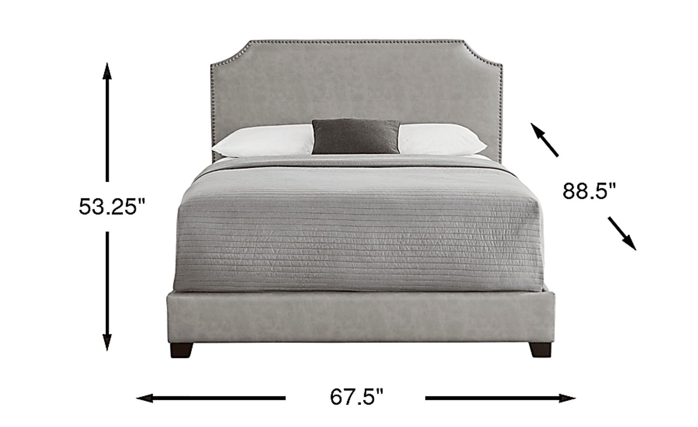 The room exhales, and rest feels closer as the Kimberley bed brings tailored calm to the bedroom. Its Belgrave silhouette rises in smooth gray upholstery, with nailhead trim tracing the gentle arch and rounded corners of the headboard. A simple upholstered footboard and small black feet keep the look clean and composed, letting understated elegance do the talking.